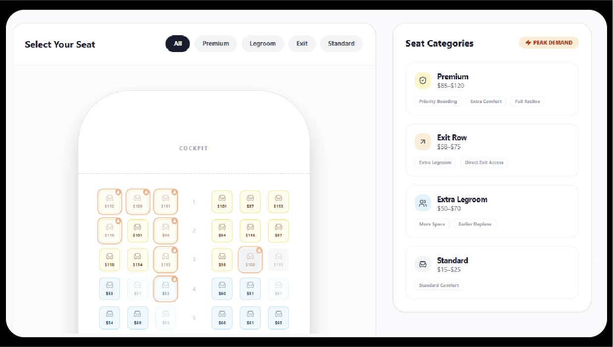 | Airline | Standard Seat | Extra Legroom | Exit Row | Premium Seat |
