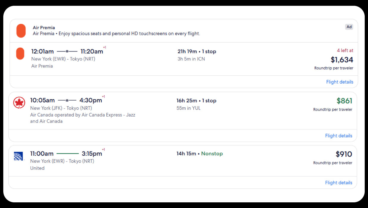 | Airline D | New York – Tokyo | 880 | 840 | 1,150 | +6% |