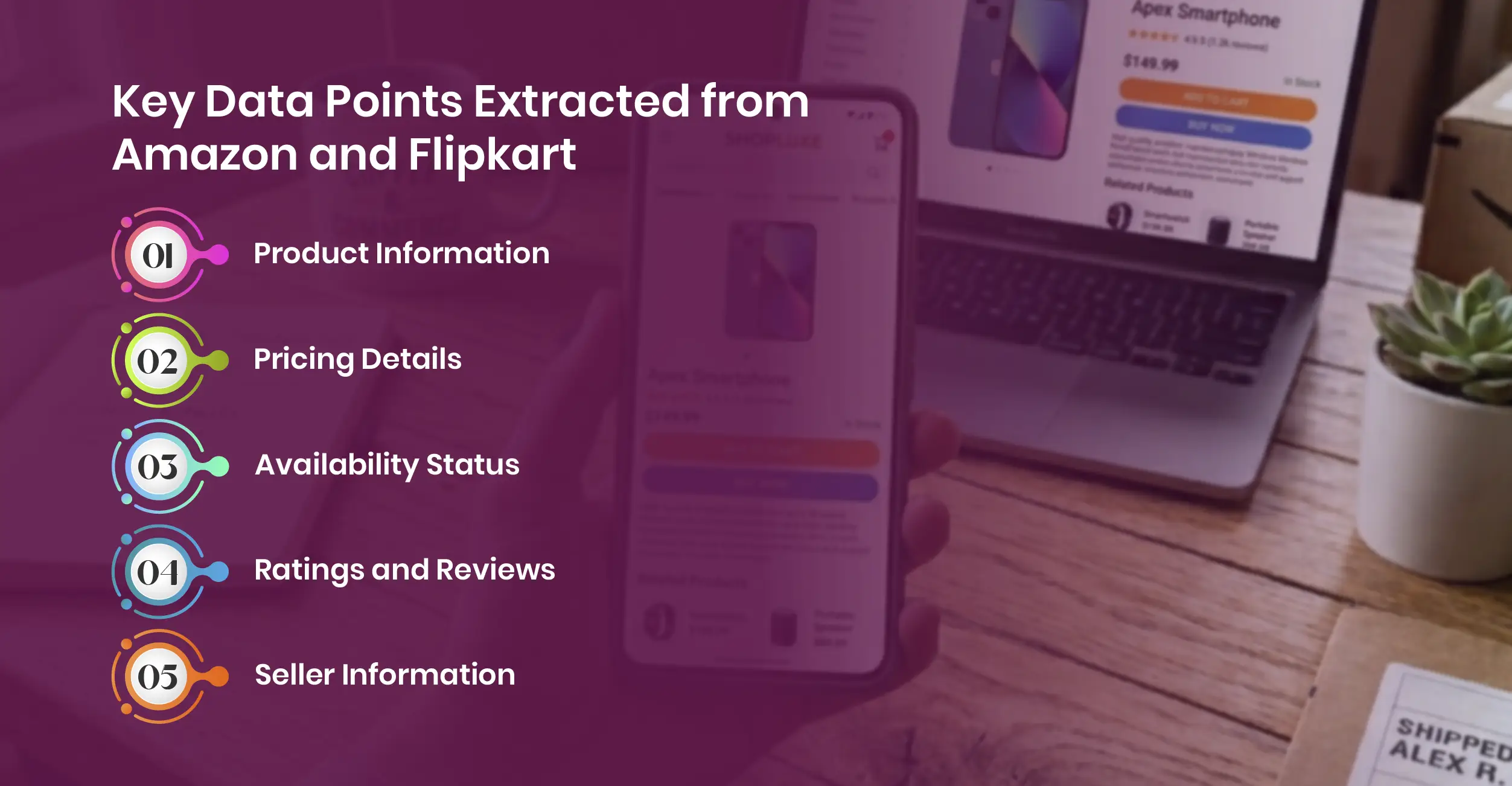 Data collected includes product names, prices, discounts, specifications, ratings, reviews, seller details, and stock availability, which helps in comprehensive market analysis.