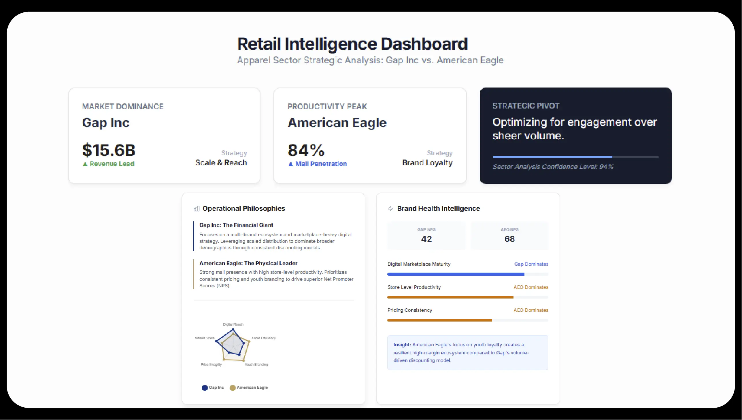 This supports a broader Apparel retail brand comparison insight: Gap competes on accessibility and volume, while AE competes on brand loyalty and lifestyle positioning.