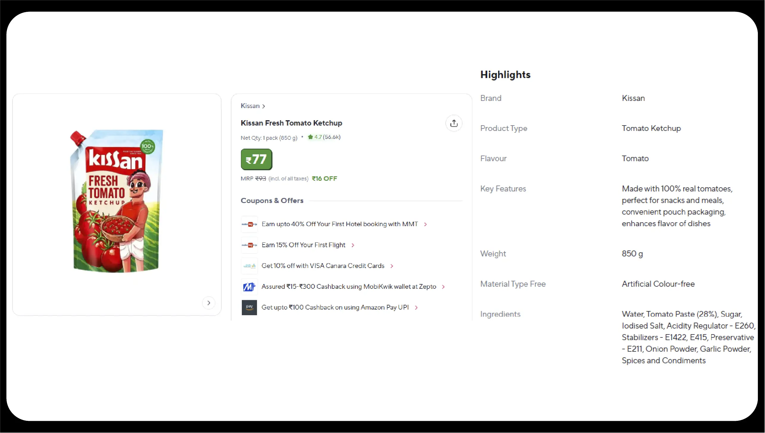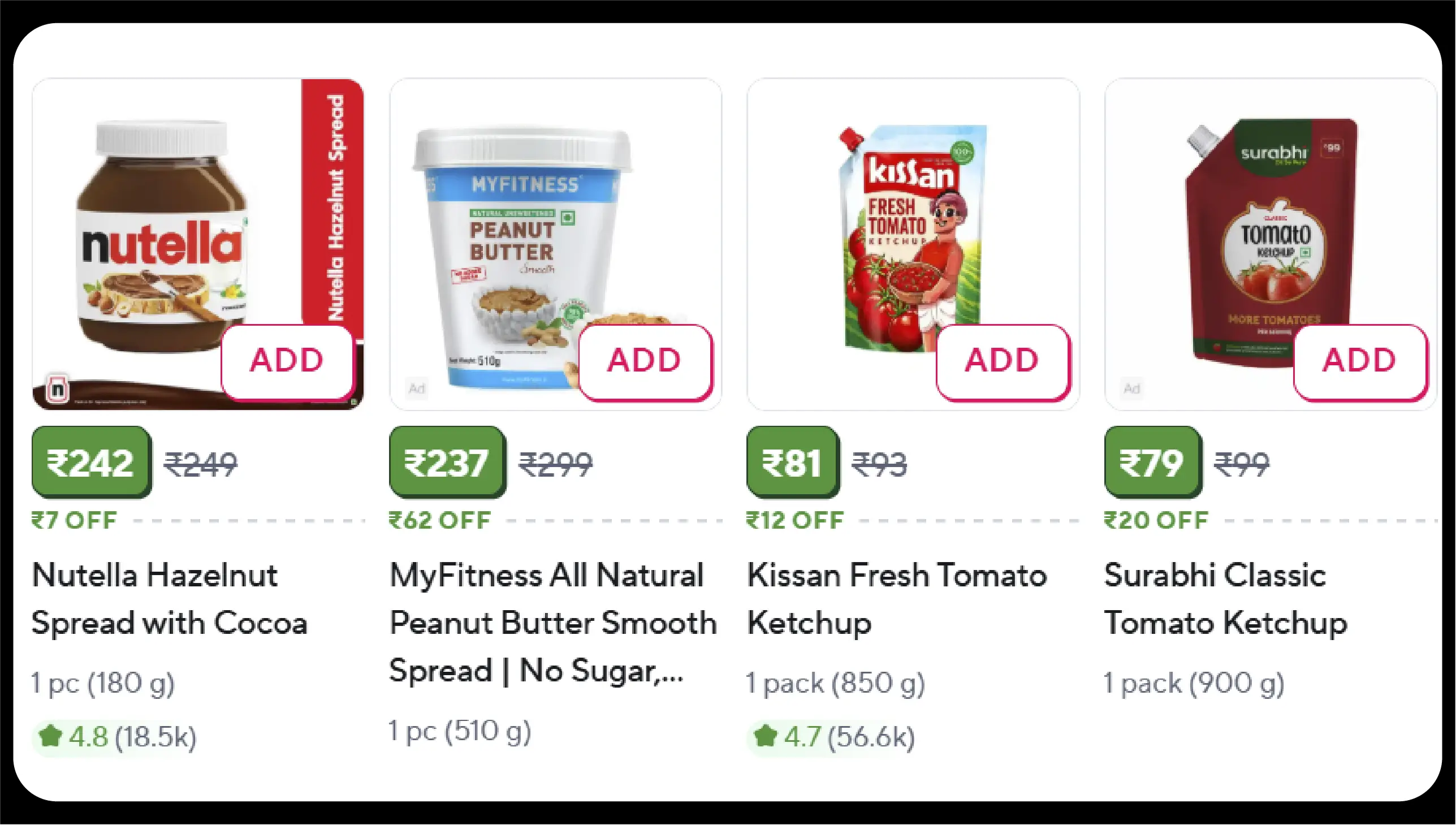 | Tomato Ketchup | Kissan | 500g | 125 | 128 | 130 |