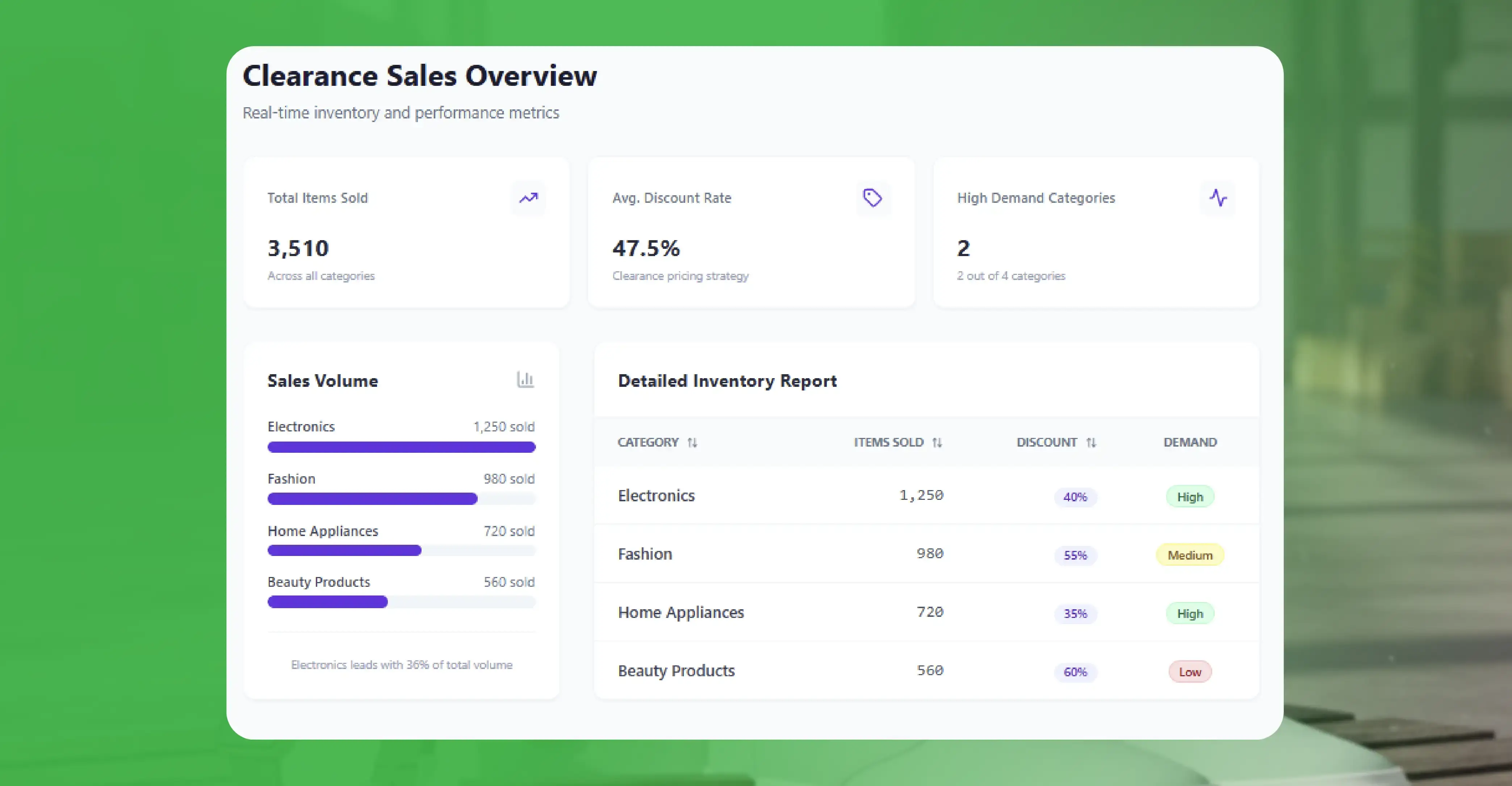 Real-time data helps businesses plan inventory accurately, prevent stockouts, and reduce overstock. Historical clearance sale insights improve forecasting and supply chain efficiency.