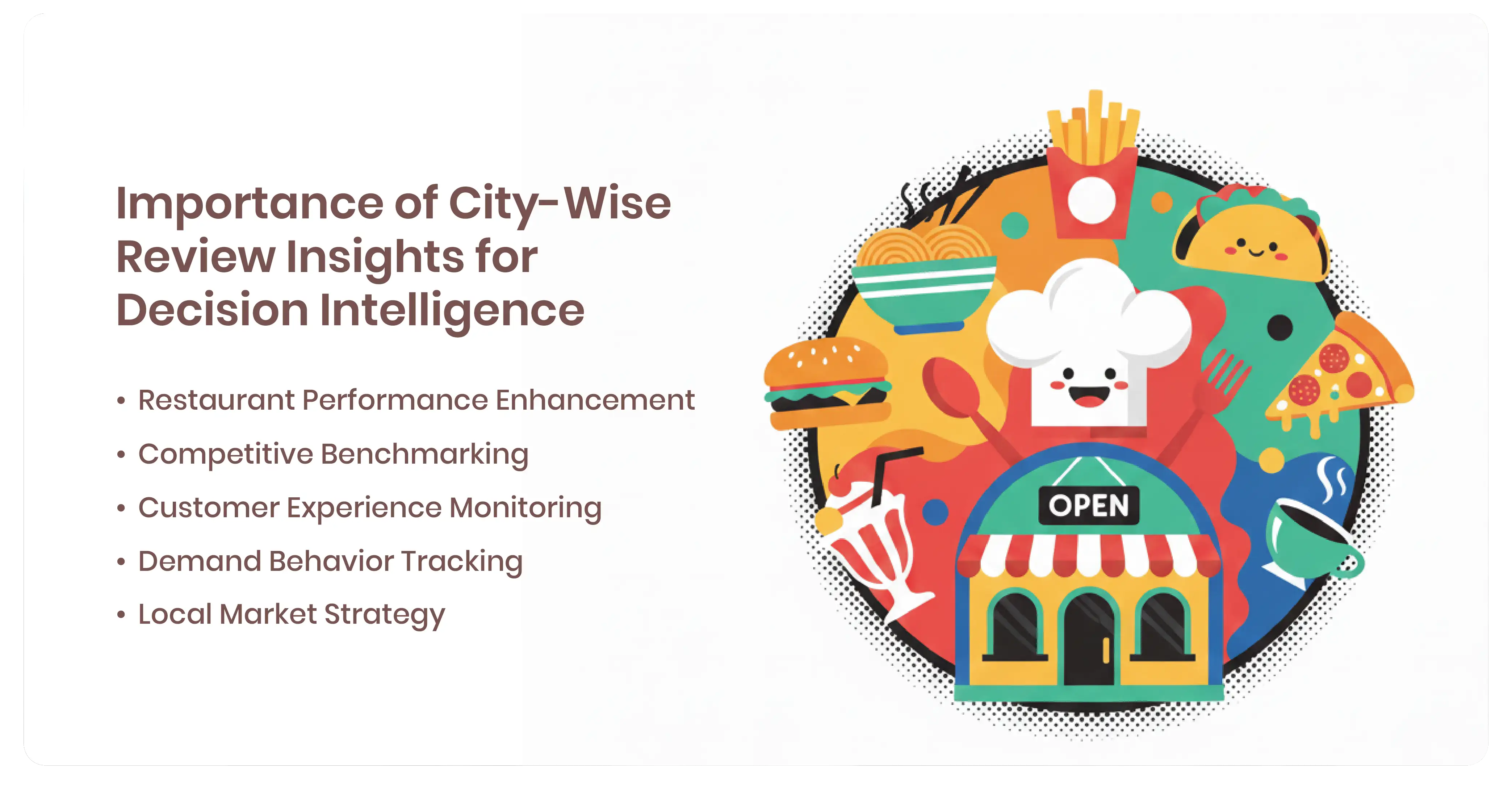 Businesses can understand customer sentiment, regional taste preferences, delivery performance, and competitor benchmarking across cities.