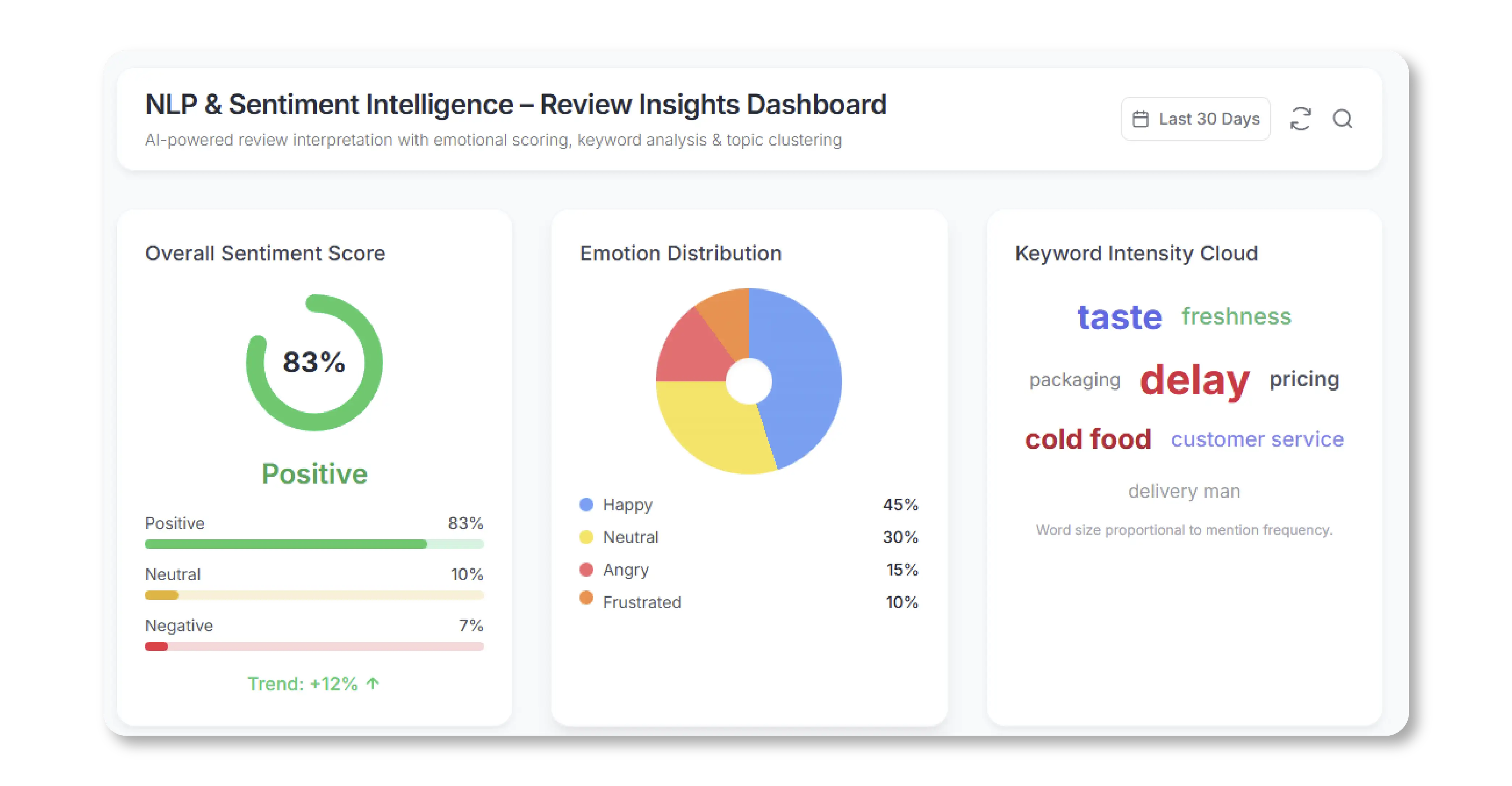 Sentiment scoring detects emotional tone, urgency patterns, reputation risks, and brand strengths. Topic modeling highlights emerging menu trends, preference shifts, and threat clusters such as repeated complaints on food temperature or delay frequencies.