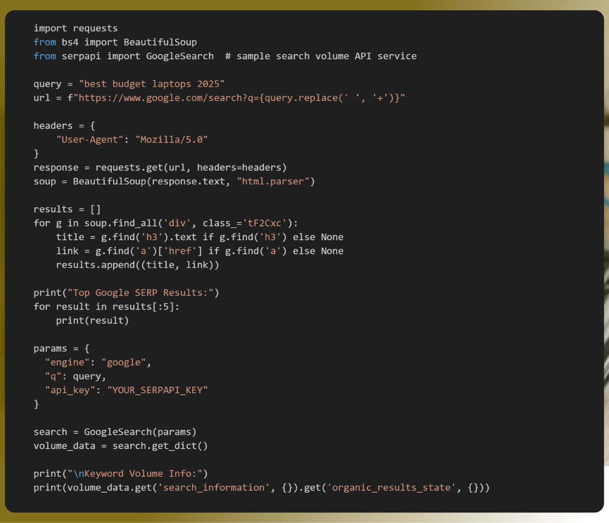 Below is a simple example demonstrating how to extract SERPs from Google results and fetch keyword volume using available libraries and APIs. This demonstration uses Python’s requests and BeautifulSoup to collect search results for the keyword “best budget laptops 2025”.